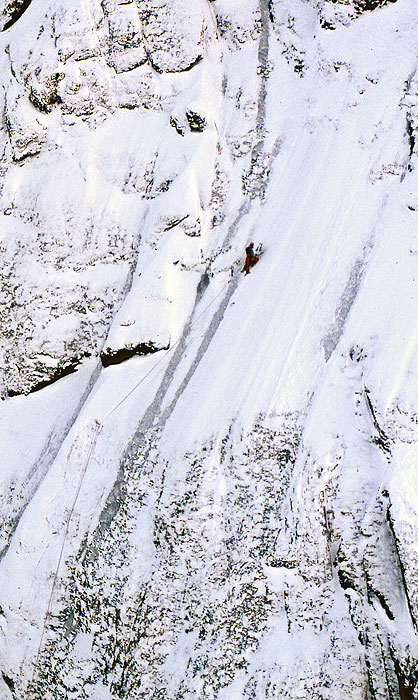 In 1991, after surviving nine intense days alone on the North Face of the Eiger, Jeff Lowe was close to topping out on his new route, which he would later give the name, Metanoia. Fifty-feet below the summit ridge and the end of his climb, he ran out of rope, the bottom end of which was anchored 150 feet below him, tied to an ice screw that also held his pack. When he couldn't find any anchors for his end of the rope, Lowe reluctantly untied from the cord and let it drop, thus abandoning his backpack, as well. He climbed unroped up the last 50 feet to the summit ridge. Shortly after his arrival on the ridge, a helicopter flew in and hovered in the air, fifty feet above.