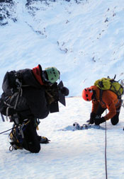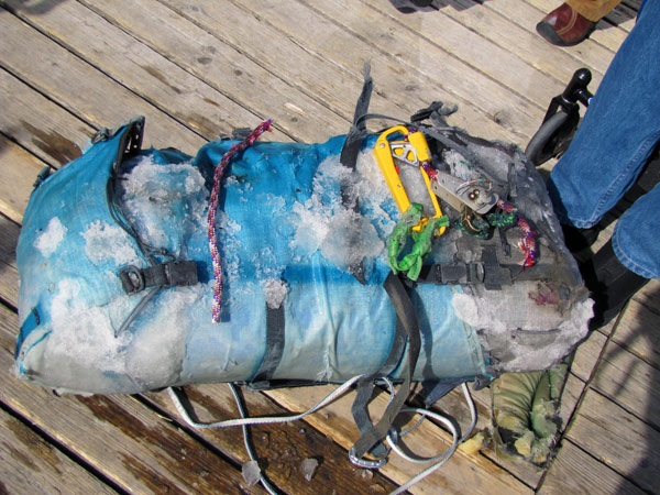 Fast forward to 2009, climbers Robert Jasper and Roger Schäli found themselves in the exact spot that Jeff Lowe had been 18 years before. They were making the world's first free ascent of the Eiger's Japanese Diretissima ("most di- rect route")—which convenes with Lowe's 1991 Metanoia route on Switzerland's Eiger, near the summit. As Jasper writes and Schali would later report back to Jeff: "After several alpine pitches and terrible traverses we finally reach the summit icefield. Here the discovery: an old backpack, frozen solid into the ice... a very welcome belay as we only took two ice- screws with us. In all probability the sack was left behind by Jeff Lowe".