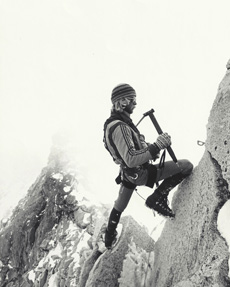 Iconic black and white photo of Jeff Lowe on Ama Dablam in 1979, taken by renowned photographer Tom Frost.