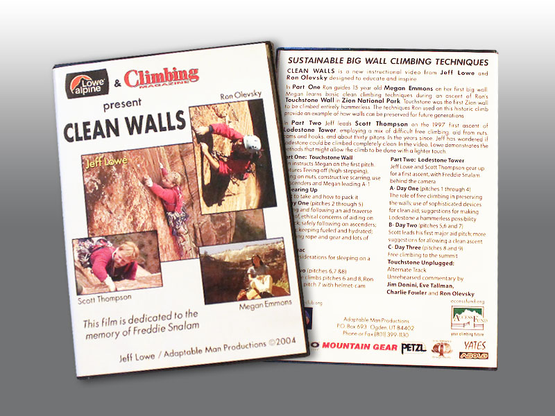 Part 1. Touchstone Wall: Ron Olevsky guides 15-year old Megan Emmons up the face of Touchstone Wall. He uses hammerless, clean climbing techniques. Part. Lodestone Tower: Jeff Lowe leads Scott Thompson on the first ascent of Lodestone Tower. He uses free climbing techniques, aids such as nuts, cams, and hooks, and about thirty pitons.